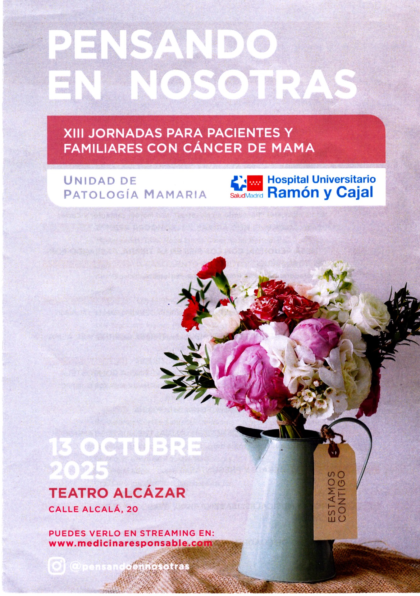 El día 13 de Octubre se celebró en el Teatro Alcazar de Madrid las XIII JORNADAS PARA PACIENTES CON CÁNCER DE MAMA Y FAMILIARES, organizada por la Unidad de Patología Mamaria del H.U. Ramón y Cajal y coordinado por la Dra. Noelia Martinez Jañez.