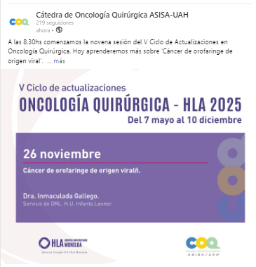 El miércoles 26 de noviembre se celebró la IX sesión del Vº Ciclo de Actualización en Oncología Quirúrgica, con el tema: 'Cáncer de orofaringe de origen viral '