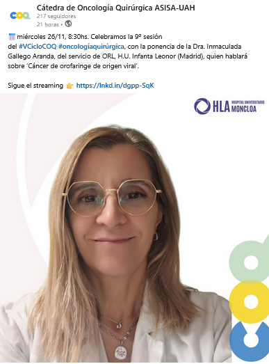 El próximo miércoles 26 de noviembre celebramos la IX sesión del Vº Ciclo de Actualizaciones en Oncología Quirúrgica, con el tema: 'Cáncer de orofaringe de origen viral '