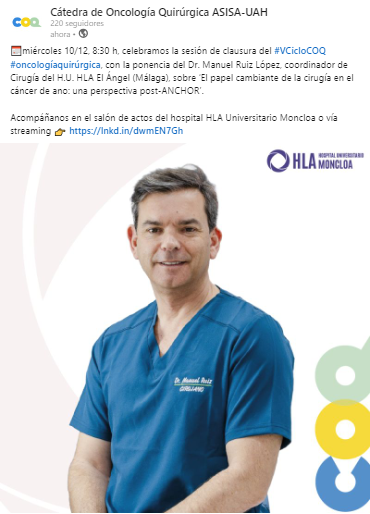 En su lugar actuará el Dr. Gustavo Díaz García, del Servicio de Cirugía General y Digestiva del H.U. Ramón y Cajal.