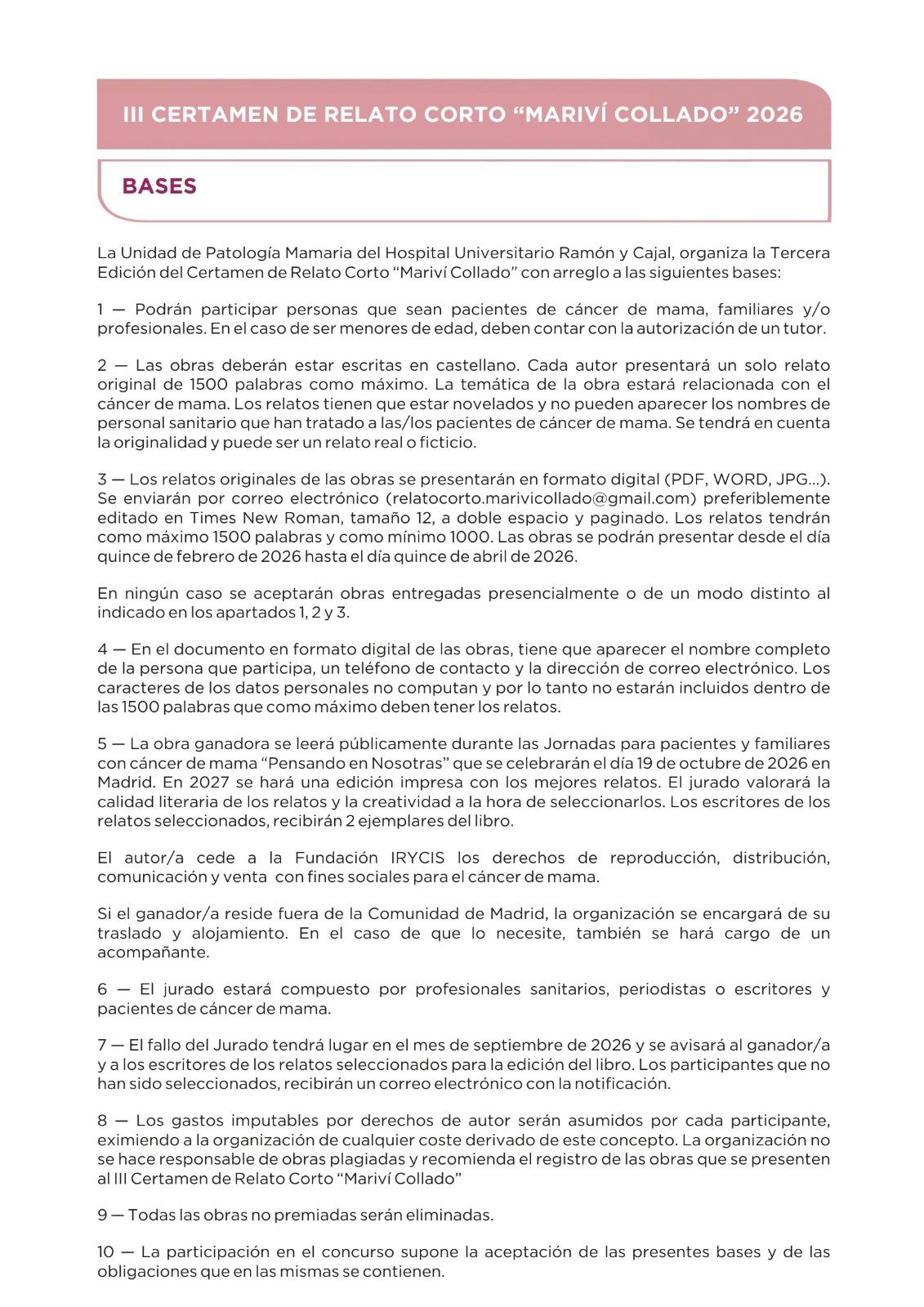 La Unidad de Patología Mamaria (UPM) del Hospital Universitario Ramón y Cajal realiza la convocatoria de la IIIª edición del premio "Mariví Collado".